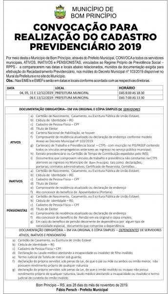 Por meio desta o Município de Bom Princípio, através do Prefeito Municipal, CONVOCA a todos os servidores municipais, ATIVOS, INATIVOS e PENSIONISTAS, vinculados ao Regime Próprio de Previdência Social – RPPS - a comparecerem nas datas e locais abaixo relacionados, munidos da documentação exigida para efetivação do Recadastramento Previdenciário, nos moldes do Decreto Municipal nº 103/2019 disponível no Mural da Prefeitura e no site do Município.