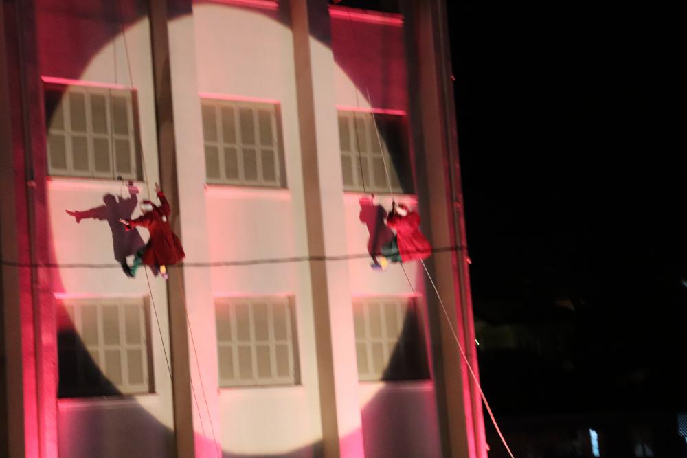 E o Papai Noel chegou, com seus ajudantes, de uma maneira pra lá de inusitada: descendo do alto do Seminário São João Vianney. Aí seguiram fogos coloridos que iluminavam o céu e as redes sociais e a entrega dos pacotinhos.