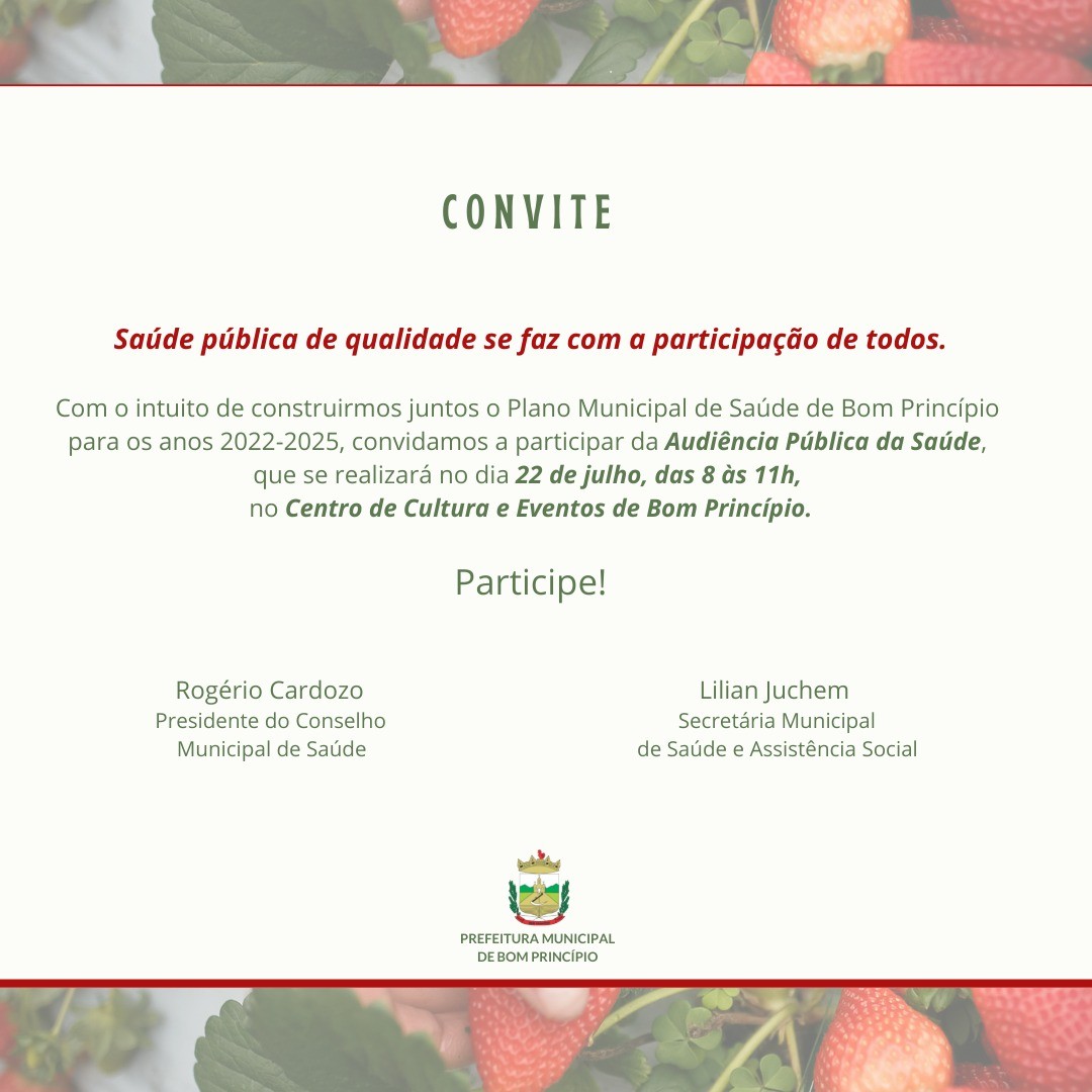 Para elaborar o Plano Municipal da Saúde do município para os anos 2022-2025, a Secretaria Municipal de Saúde e Assistência Social, juntamente com o Conselho Municipal de Saúde, estarão promovendo uma Audiência Pública da Saúde. O evento é aberto a todos e ocorre na próxima quinta-feira, dia 22 de julho, das 8 às 11h, no Centro de Cultura e Eventos de Bom Princípio.
