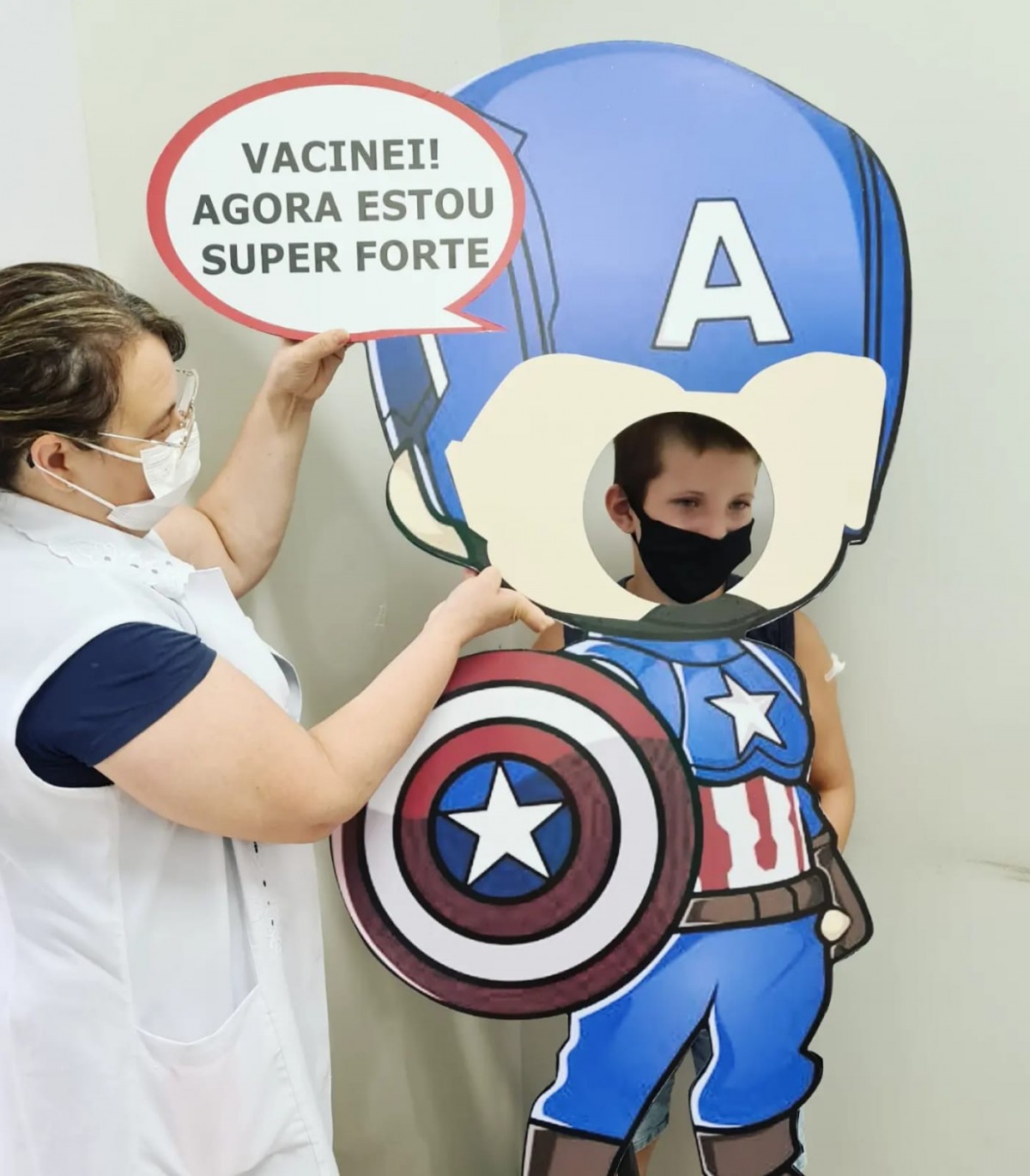 Igor Mateus Pinto Zimmermann, de 8 anos, foi a primeira criança do município a ser vacinada contra a Covid-19, na manhã desta sexta-feira. Ele estava ansioso para ser imunizado e depois de receber a picadinha ainda posou para foto num dos tótens de super-heróis que estão na UBS da sede.