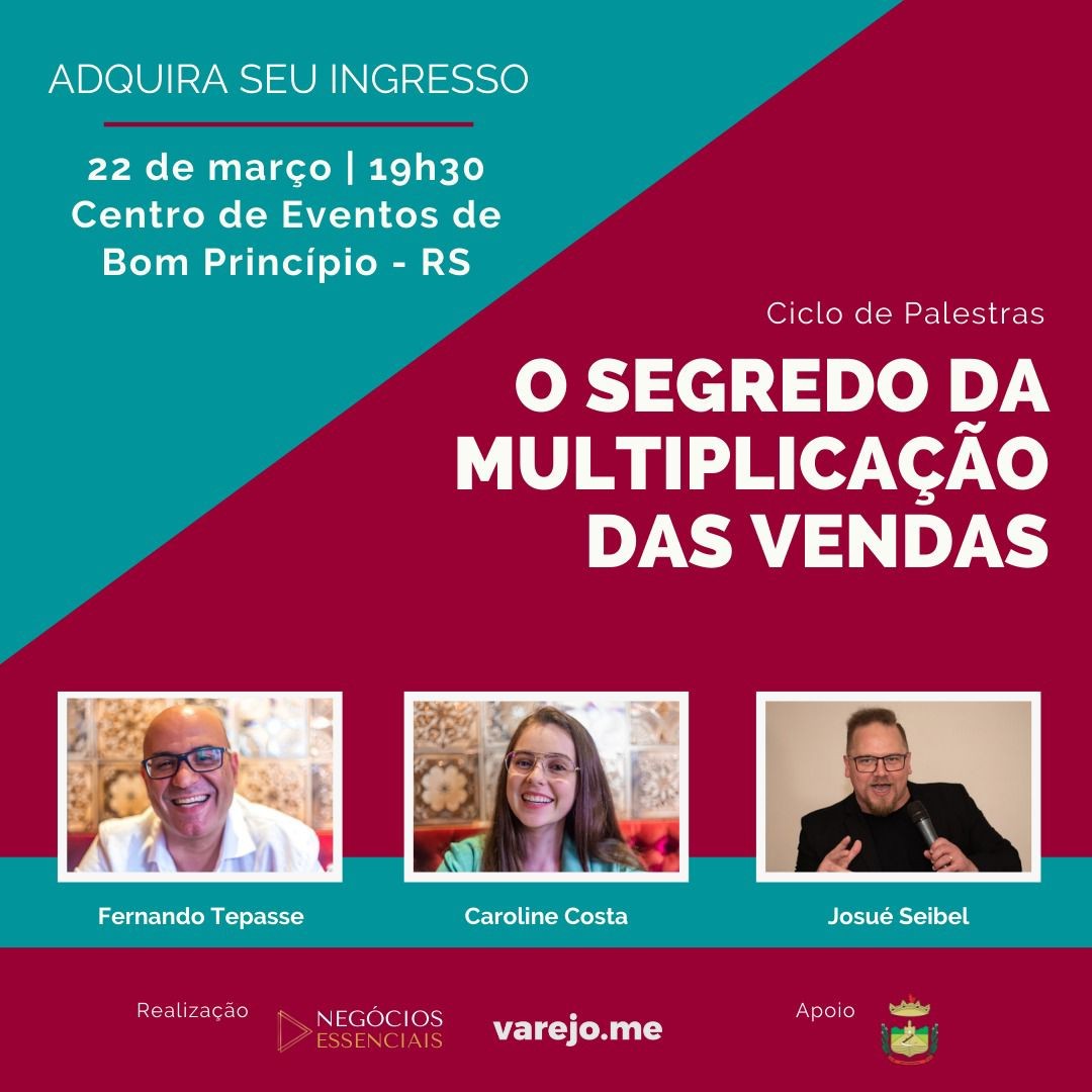 A Varejo.me e o Negócios Essenciais estão promovendo dia 22 de março o Ciclo de Palestras “O segredo da multiplicação das vendas”, com Josué Seibel, Caroline Costa e Fernando Tepasse. O trio de artistas de alma e mentores de negócios trará a Bom Princípio um evento repleto de surpresas e arte, mas com o objetivo claro de motivar e dar ferramentas aos profissionais de todas as áreas para que potencializem seus resultados. Serão duas palestras, performances, interatividade e vivências únicas que vão das 19h30 às 21h30. Os ingressos podem ser adquiridos na Belinha Calçados de Bom Princípio ou pelo site negociosessenciais.com.br/ciclo-de-palestras.