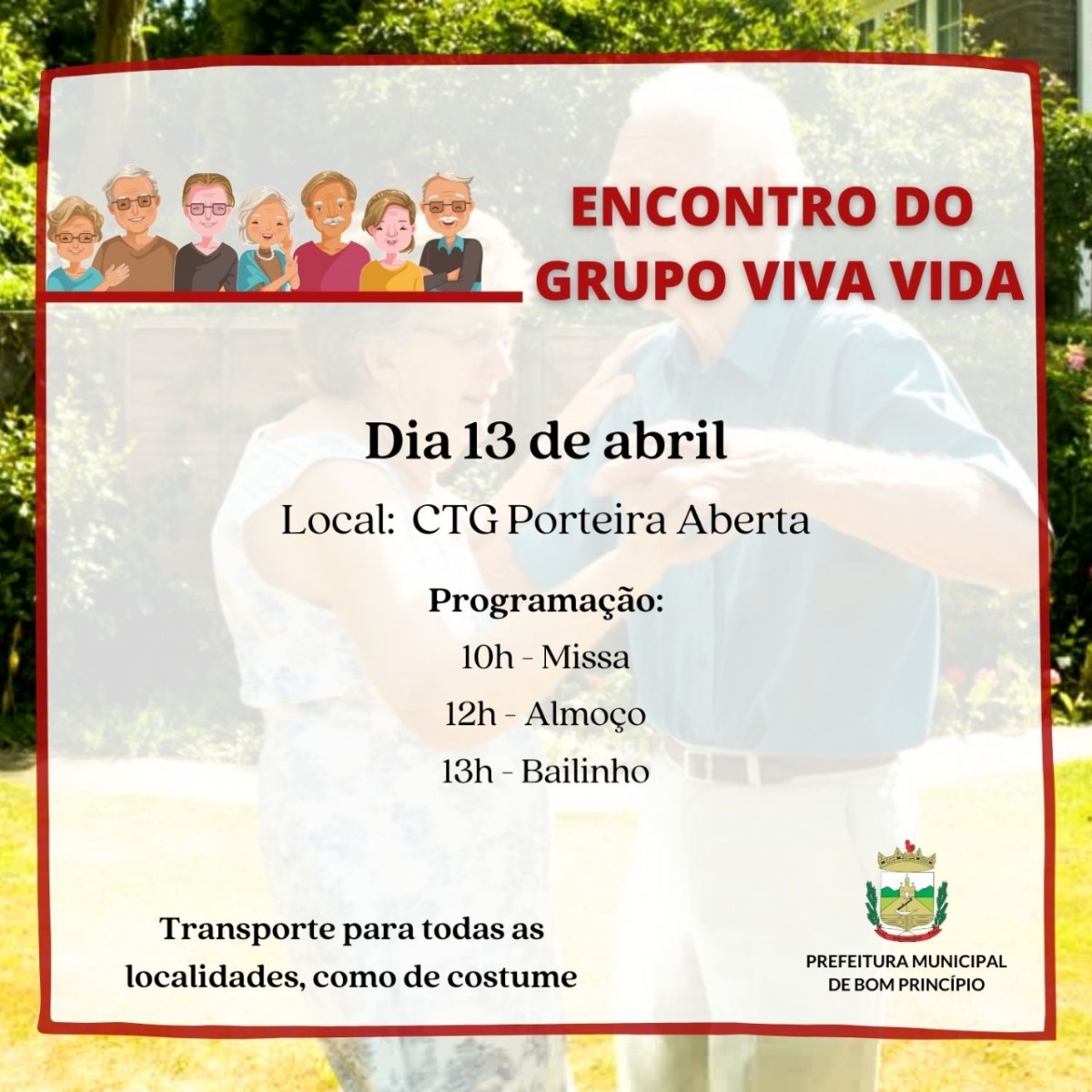 A programação prevê missa às 10h, almoço ao meio-dia e bailinho a partir das 13h. Conforme os coordenadores do grupo, haverá transporte até o local do evento, que desta vez será no CTG Porteira Aberta.