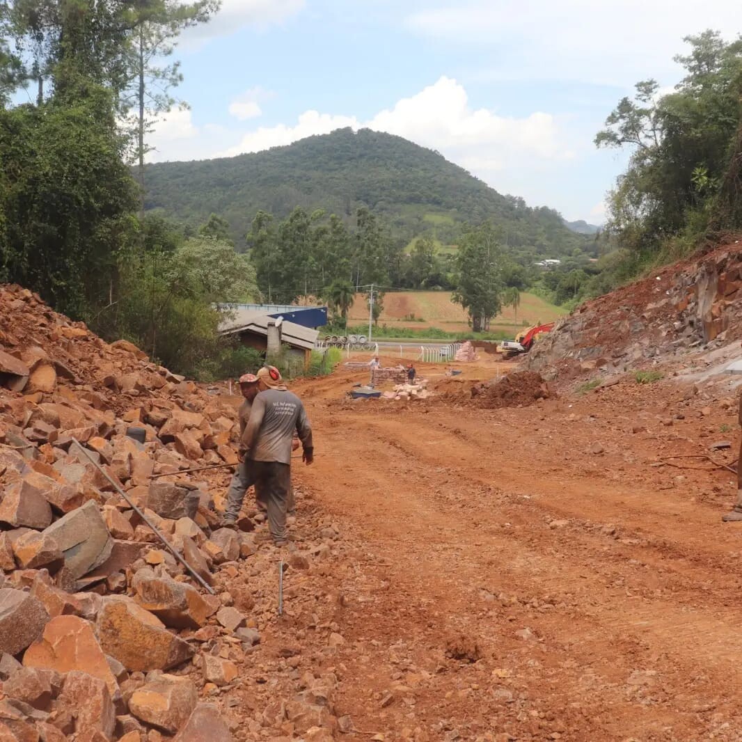 O prefeito Fábio Persch, o secretário de Infraestrutura Adriano Artus e o servidor das Obras Flávio Schmitz estiveram no local na tarde de ontem, aproximadamente na metade do trecho, onde ainda está sendo feita detonação para deixar o alinhamento da via como necessário.
