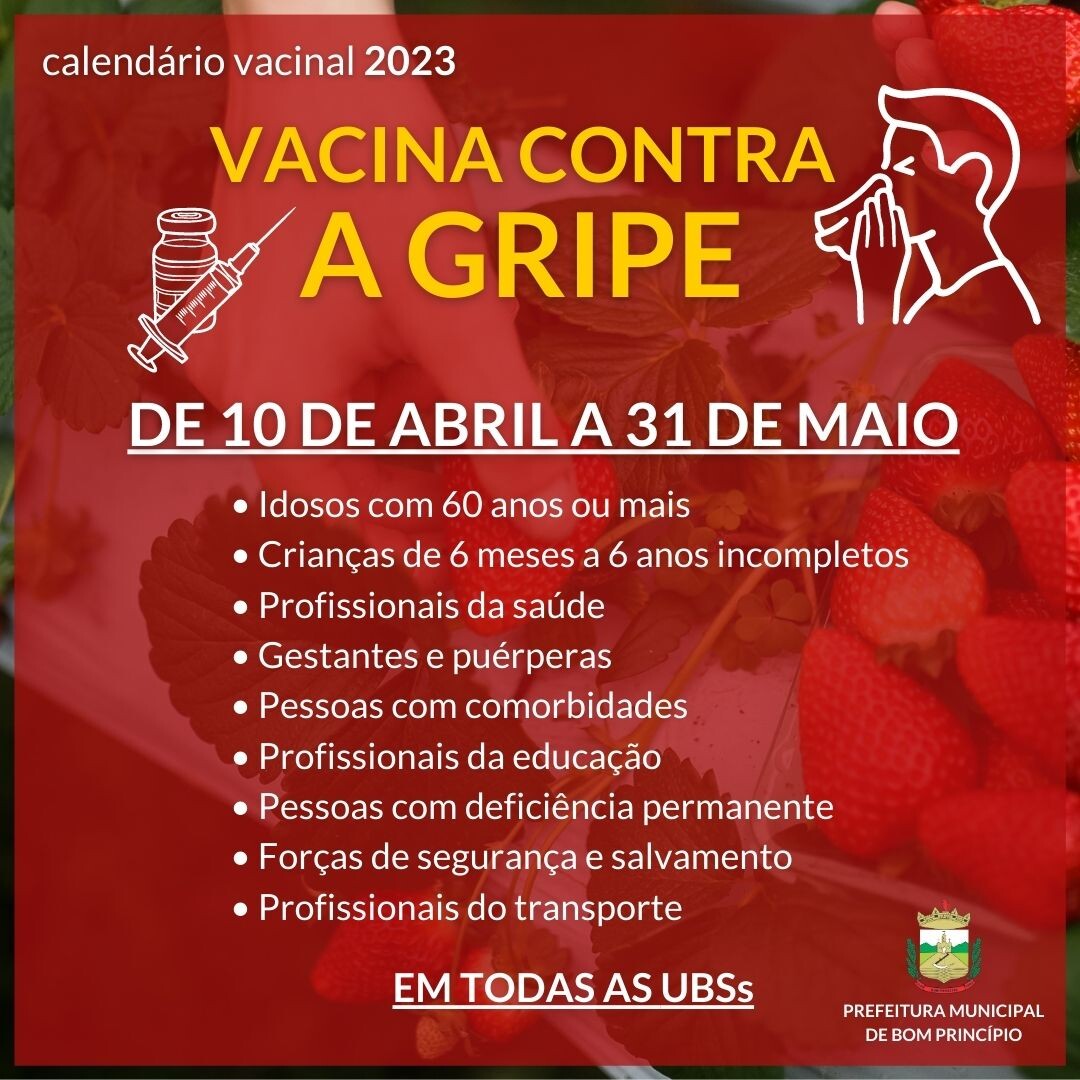 Desde o dia 10 de abril, todos os postos de saúde do município estão engajados na campanha nacional de vacinação contra a gripe. Nesta primeira etapa, que vai até 31 de maio, ocorre a campanha de vacinação contra o Influenza para o grupo prioritário.