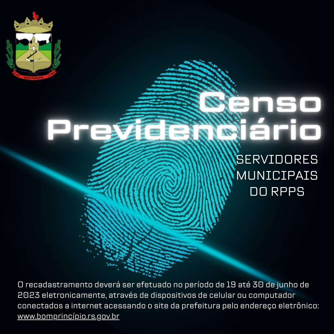 Por meio desta o Município de Bom Princípio, COMUNICA a todos os servidores municipais, ATIVOS, INATIVOS e PENSIONISTAS, vinculados ao Regime Próprio de Previdência Social – RPPS - a efetuarem o recadastramento previdenciário, no endereço eletrônico disponível em: http://www.xn--bomprincpio-vcb.rs.gov.br/ área Publicações Oficiais, Pessoal, Censo Previdenciário ou diretamente pelo link: Concurso Público / CENSO PREVIDENCIÁRIO (bomprincipio.rs.gov.br). Para os servidores Ativos é obrigatório anexação do EXTRATO PREVIDENCIÁRIO que deve ser obtido no site https://www.gov.br/pt-br/temas/meu-inss , na área EXTRATO PREVIDENCIÁRIO (CNIS).