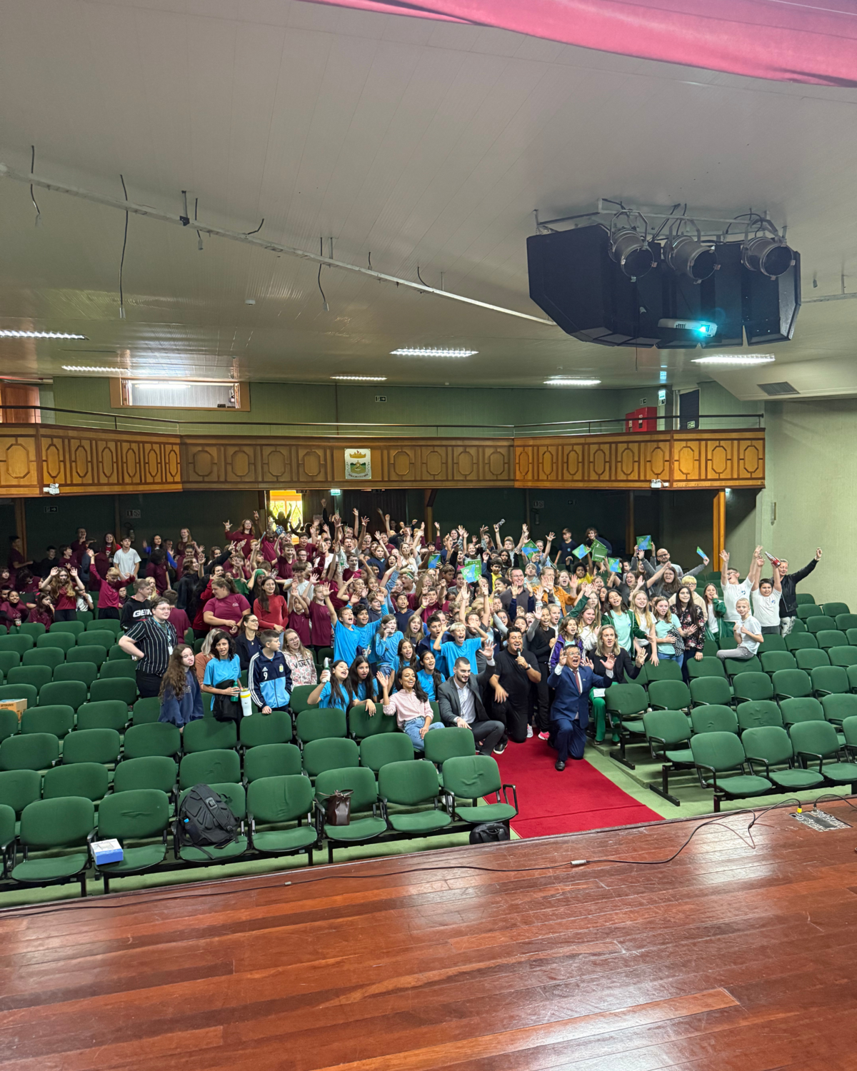 A culminância do projeto foi a realização da palestra musicada, que reuniu o autor Rodrigo Munari e os estudantes para um momento interativo e cultural. Além de Rodrigo, o evento também contou com a participação de Alcides Seiji Yano, delegado da Receita Estadual de Novo Hamburgo, e Décio Rauber, chefe da seção do Programa de Integração Tributária da DRCM (Divisão de Relacionamento com Cidadãos e Municípios) e representante da Sefaz RS.