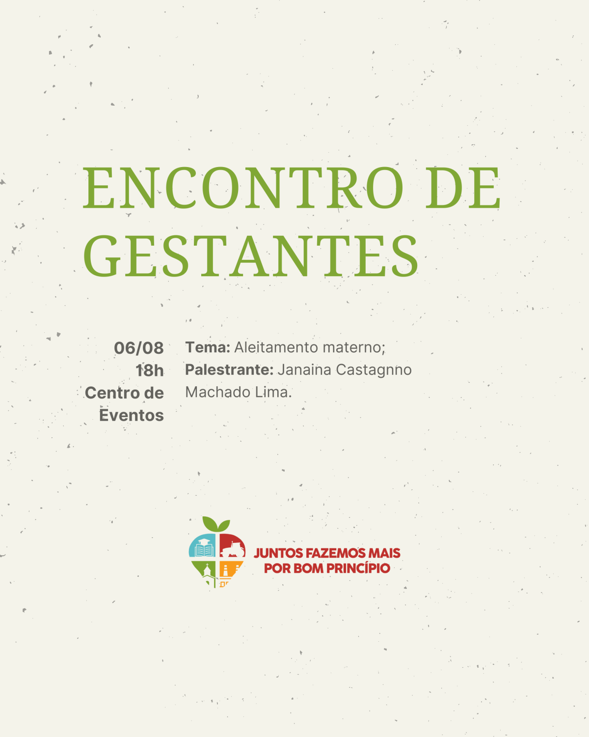 O tema deste encontro será o aleitamento materno, um dos pilares do cuidado nos primeiros meses de vida do bebê. A palestra será conduzida pela enfermeira Janaina Castagnno Machado Lima, profissional que trará orientações práticas e importantes sobre os benefícios da amamentação, mitos, manejo correto e como lidar com possíveis dificuldades.