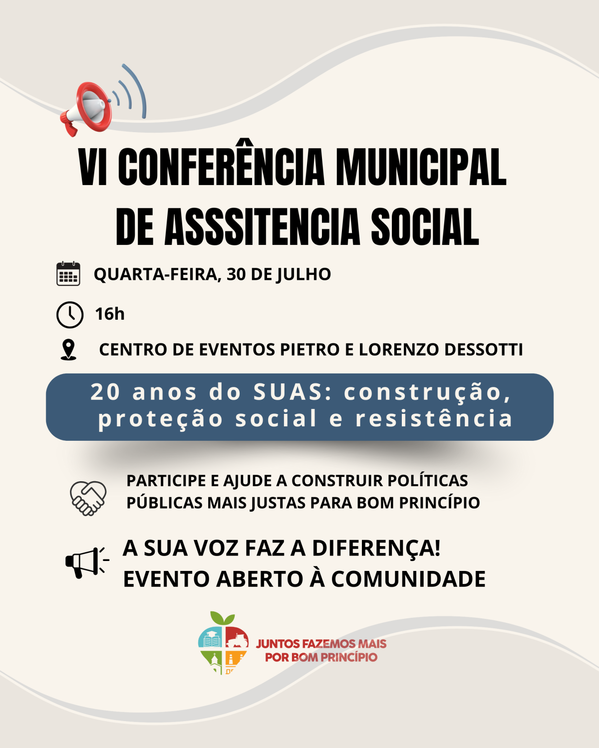 O Conselho Municipal de Assistência Social, em parceria com a Secretaria Municipal de Saúde e Assistência Social de Bom Princípio, convida toda a comunidade para participar da VI Conferência Municipal de Assistência Social. O evento está marcado para esta quarta-feira, 30 de julho, às 16h, no Centro de Eventos Pietro e Lorenzo Dessotti.