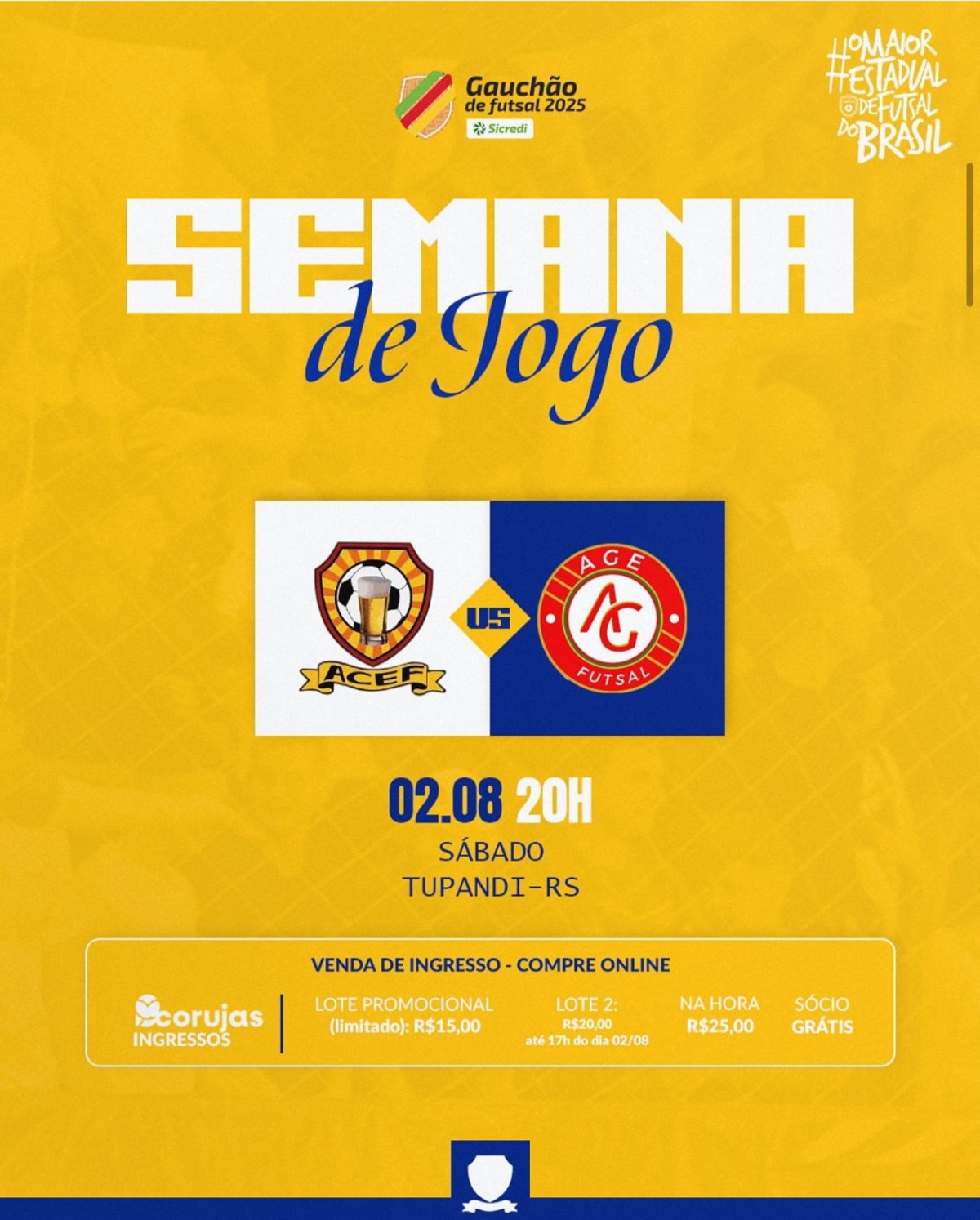 A equipe do Filtradores volta à quadra neste sábado, 2 de agosto, em mais um desafio pelo Gauchão de Futsal. O confronto será em casa, no Ginásio Poliesportivo de Tupandi, a partir das 20h, contra a tradicional equipe da AGE, e promete movimentar a torcida local.