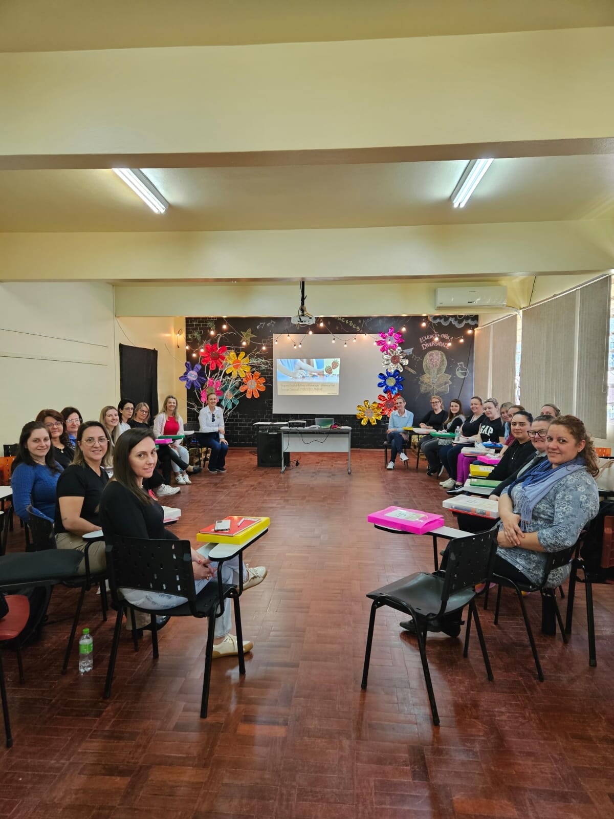 O primeiro encontro foi cuidadosamente planejado pela formadora, em parceria com a articuladora Grasiela Zimmer Vogt e a coordenadora Marieli Rodrigues da Silva Corrêa, promovendo um momento acolhedor, de escuta e troca de experiências.