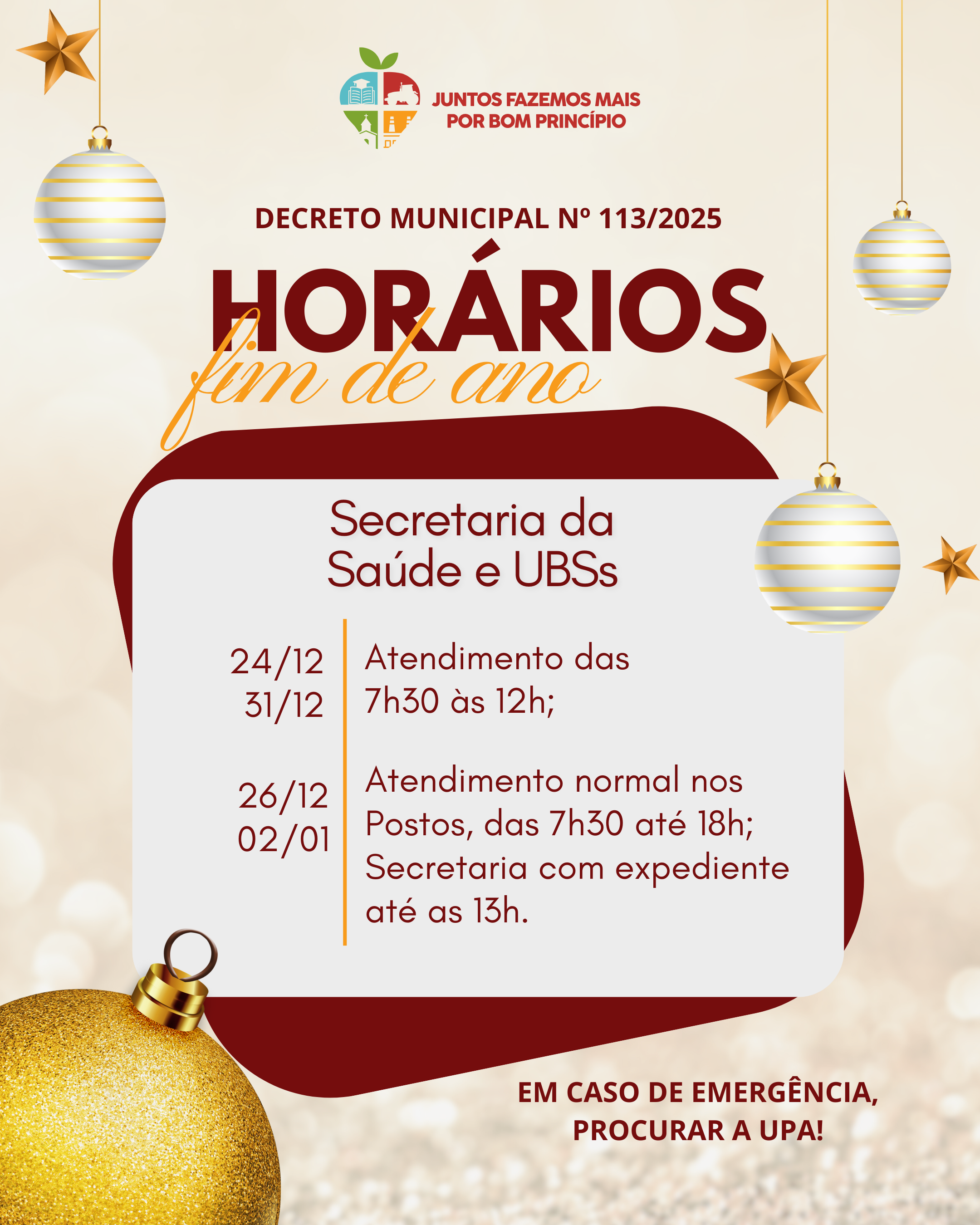 Em razão das festividades de final de ano, a Secretaria de Saúde e Assistência Social e as Unidades Básicas de Saúde (UBSs) terão horários diferenciados de atendimento. Para se organizar e evitar transtornos, fique atento aos dias e horários de funcionamento neste período.