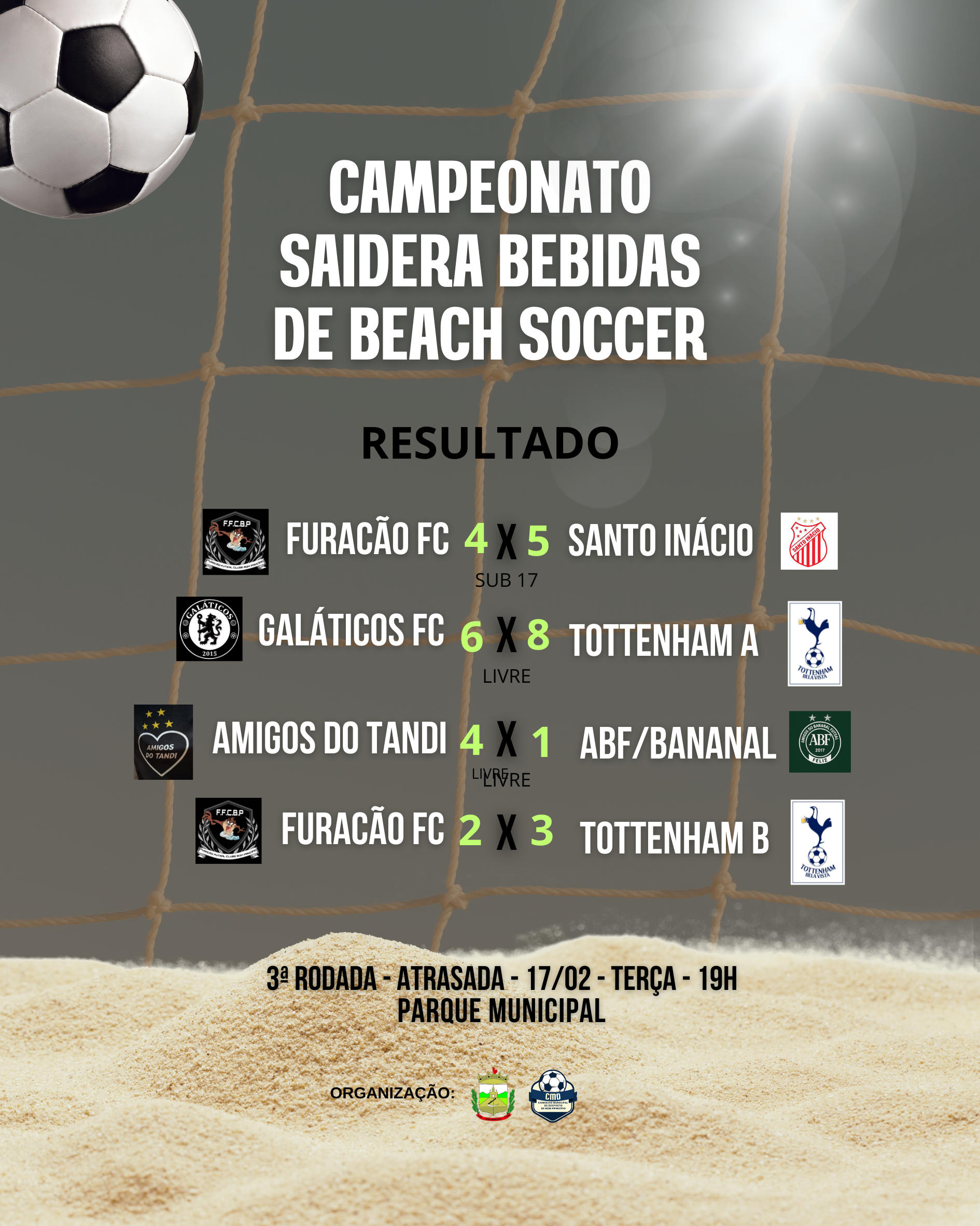 A 3ª rodada da Copa Saidera Beach Soccer, inicialmente prevista para a quinta-feira (12/02), foi disputada na terça-feira, dia 17 de fevereiro, na cancha do Parque Municipal, em Bom Princípio. A rodada foi marcada por partidas equilibradas e muitos gols.