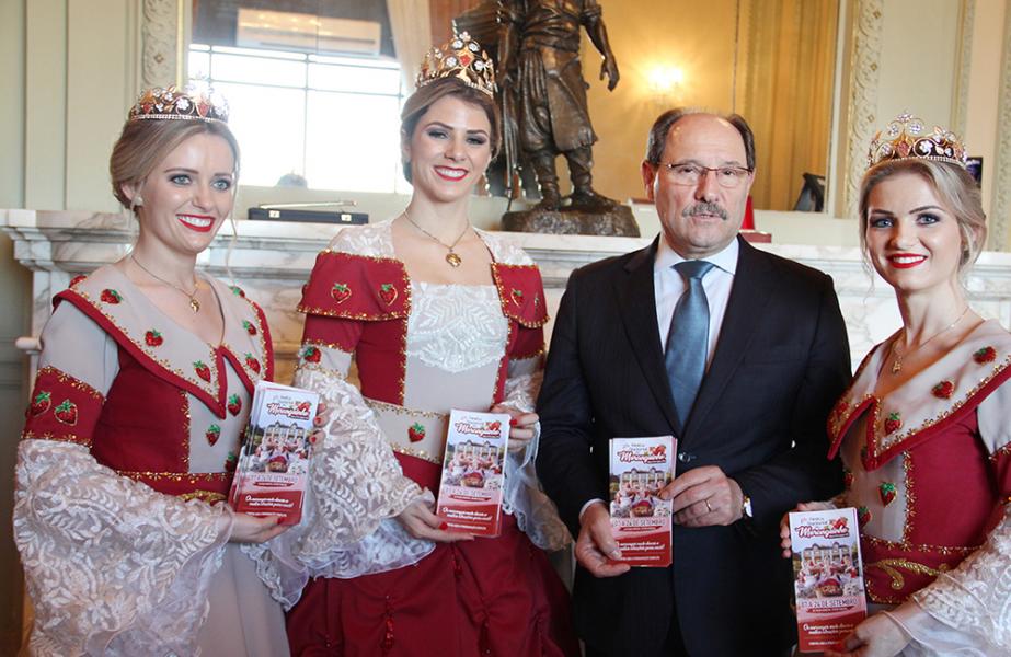 A rainha Thais Klering e das princesas Sabrina Lermen e Síntia Schweikart entregaram convites ao governador José Ivo Sartori, na Secretaria Estadual do Desenvolvimento Rural, Pesca e Cooperativismo, na Assembleia Legislativa, e à direção do Banrisul. Além dos jornalistas e comunicadores do Grupo RBS. Junto com os convites, em cada local foram entregues também bandejas de morangos in natura e kits de produtos à base da fruta – uma “assinatura” sempre de sucesso imediato.