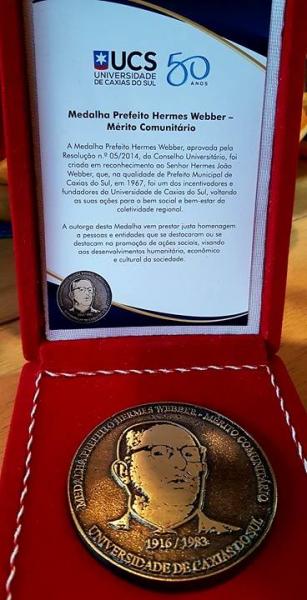 O prefeito Fábio Persch recebeu ontem, em Caxias do Sul, a Medalha Prefeito Hermes Webber. A homenagem da Universidade de Caxias do Sul (UCS) à prefeitura de Bom Princípio ocorreu à noite, no Salão de Atos da UCS e integrou as comemorações dos 50 anos da instituição. Fábio foi um dos 32 agraciados, entre personalidades, entidades e empresas, associações e municípios. Outorgada pelo Conselho Universitário, Medalha é uma homenagem a personalidades, entidades, empresas, associações e municípios que se destacaram ou se destacam na promoção de ações sociais que visam ao desenvolvimento humanitário, econômico e cultural da sociedade.