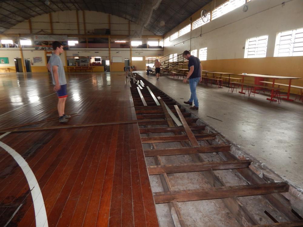 O prefeito foi vistoriar a obra juntamente com o setor de engenharia da prefeitura constatando onde estão os maiores problemas, em especial, de infiltração. Será feita modificação na estrutura de engenharia para que o problema não ocorra novamente, sendo, apenas aí, substituído o piso de madeira, com uma nova e mais moderna estrutura, inclusive, com amortecimento, o que melhora a condição de jogo.