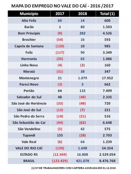 A variação dos dados de trabalho no Vale do Caí foi apresentada na manhã de segunda-feira pelo Coredes Vale do Caí (tabela em tons de azul). Assim, é possível ter uma noção preliminar de como foi o ano de 2018 em relação aos empregos formais no vale do Caí. Os números apresentam, de maneira destacada, Montenegro e Bom Princípio, como aqueles que mais tiveram geração de vagas de trabalho. Em Montenegro foram mais de 1 mil novos postos de trabalho, enquanto que, em Bom Princípio, o saldo positivo é de 282 novos empregos formais.