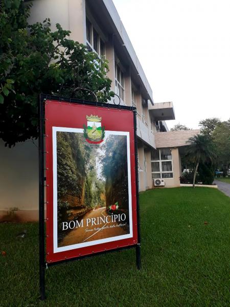 A bela praça dos Ipês, no entorno da prefeitura de Bom Princípio, ficou ainda mais chamativa com a instalação de um grande banner, apresentando à comunidade a nova identidade visual de Bom Princípio.