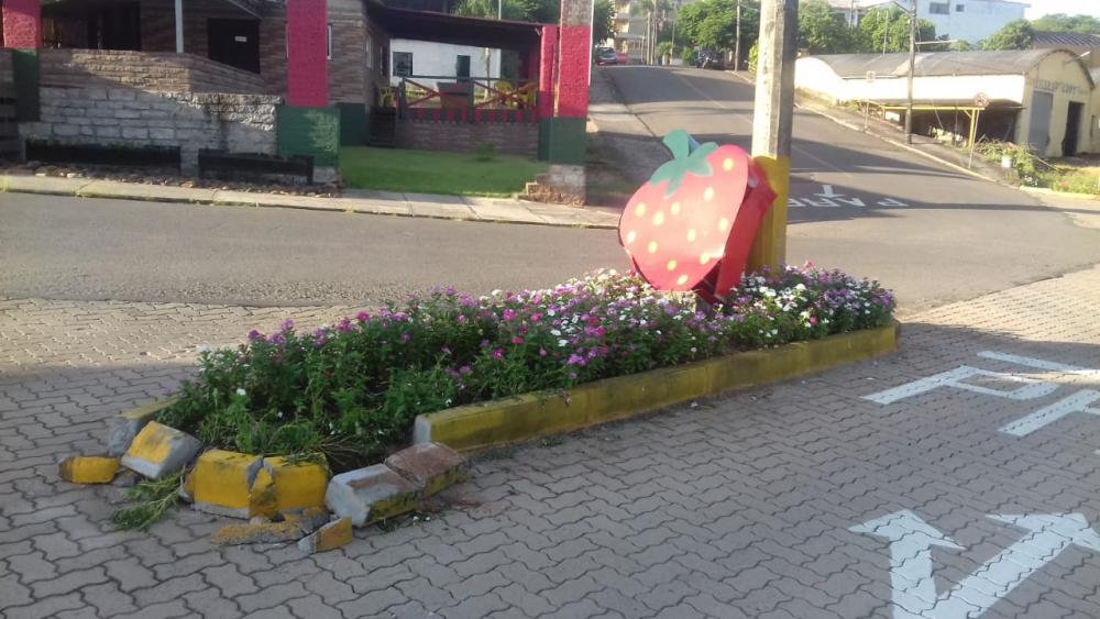 De acordo com o servidor João Kirch, que cuida das questões ligadas à dívida ativa, foi feito registro policial do fato ocorrido no final de semana. A placa, em forma de morango, colocando em meio a um canteiro na rua Celestino Volkweiss, foi atingido, no final de semana, possivelmente por um veículo de grande porte. Não apenas o morango, revitalizado há alguns dias, como também o canteiro ficou bastante avariado, cabendo agora a averiguação do fato de modo que os responsáveis sejam identificados. "Não cabe ao município arcar com custos como este, é preciso que os responsáveis sejam identificados e notificados", destacou Kirch.
