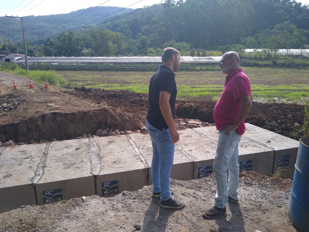 Tubos de 2 metros de altura por 1,5 metro de largura foram instalados na travessia da rua Arsênio Maldaner, fazendo com que as águas do arroio sigam o curso determinado e não mais prejudiquem o trânsito na estrada.