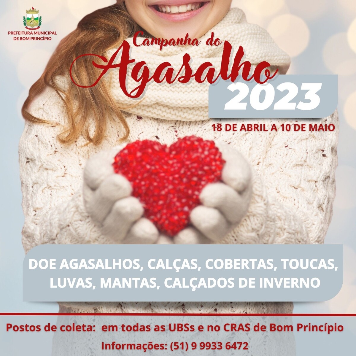 A partir do dia 18 até o dia 10 de maio, todos os postos de saúde do município e também o CRAS estarão recebendo doações, que serão distribuídas à população mais vulnerável de Bom Princípio nos dias 16 e 17 de maio.