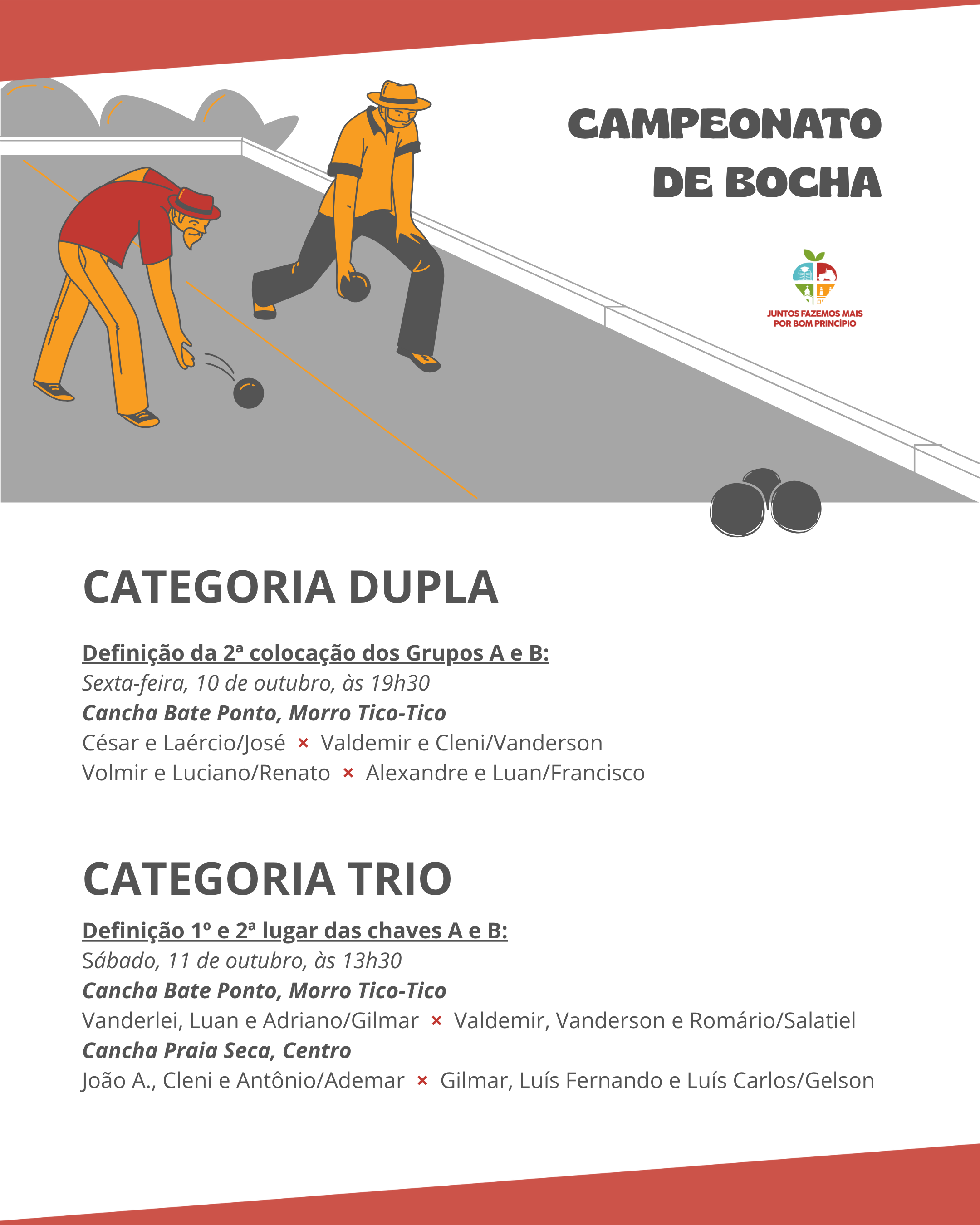 Já na categoria trios, mais empates na classificação. Por isso, no próximo sábado as equipes disputarão, em jogo único, as posições na tabela. Confira a seguir os confrontos.
